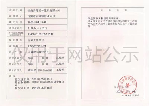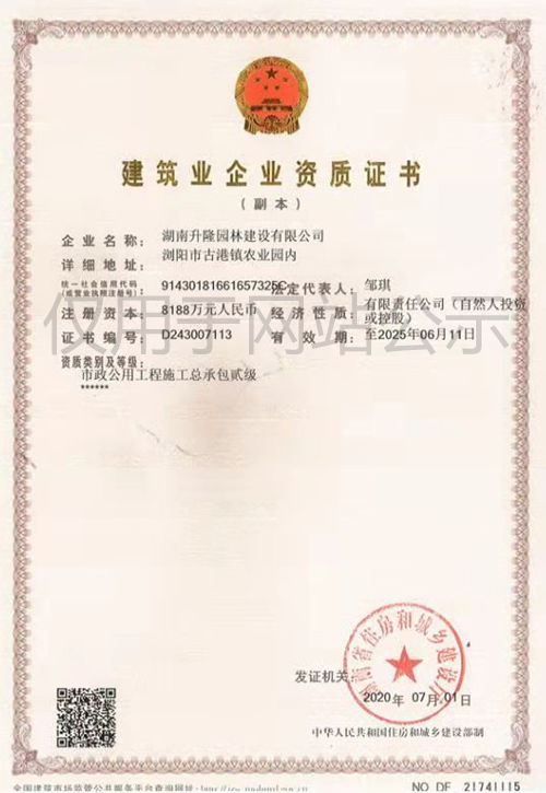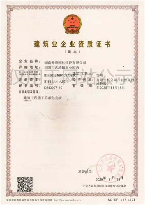湖南升隆園林建設(shè)有限公司(曾用名稱:瀏陽(yáng)市升隆園林有限責(zé)任公司)成立于2007年4月,注冊(cè)資本8188萬(wàn)元,現(xiàn)已取得市政公用工程施工總承包貳級(jí),建筑工程施工總承包叁級(jí),風(fēng)景園林工程設(shè)計(jì)專項(xiàng)乙級(jí)資質(zhì),城市園林綠化企業(yè)施工貳級(jí)資質(zhì)。公司位于瀏陽(yáng)市東郊的農(nóng)業(yè)科技產(chǎn)業(yè)園內(nèi),專業(yè)從事市政公用工程施工總承包;風(fēng)景園林工程設(shè)計(jì)服務(wù);建筑裝修裝飾工程專業(yè)承包;城市道路養(yǎng)護(hù);古建筑工程專業(yè)承包;古建筑工程服務(wù);市政道路路面工程服務(wù);市政設(shè)施管理;環(huán)保工程專業(yè)承包;鋼結(jié)構(gòu)工程專業(yè)承包;建筑鋼結(jié)構(gòu)、預(yù)制構(gòu)件工程、電力安防工程的安裝服務(wù);建筑勞務(wù)分包;土石方工程服務(wù);合同能源管理;綠化病蟲(chóng)防治管理;綠化養(yǎng)護(hù);苗木、林木種子銷(xiāo)售;花卉作物、花盆栽培植物零售;花卉、苗木的種植;林木育苗;林木育種;林木種子生產(chǎn);工程技術(shù)咨詢服務(wù);工程項(xiàng)目管理服務(wù);園林綠化工程、城市及道路照明工程、亮化工程、水利水電工程、電力工程的施工;景觀和綠地、室外體育設(shè)施工程施工;造林、育林;水電安裝;水利水電工程檢測(cè)技術(shù)咨詢服務(wù);水利水電工程施工總承包;電力工程施工總承包;輸變電工程專業(yè)承包;勞務(wù)外包服務(wù);建筑工程施工總承包。(依法須經(jīng)批準(zhǔn)的項(xiàng)目,經(jīng)相關(guān)部門(mén)批準(zhǔn)后方可開(kāi)展經(jīng)營(yíng)活動(dòng))。